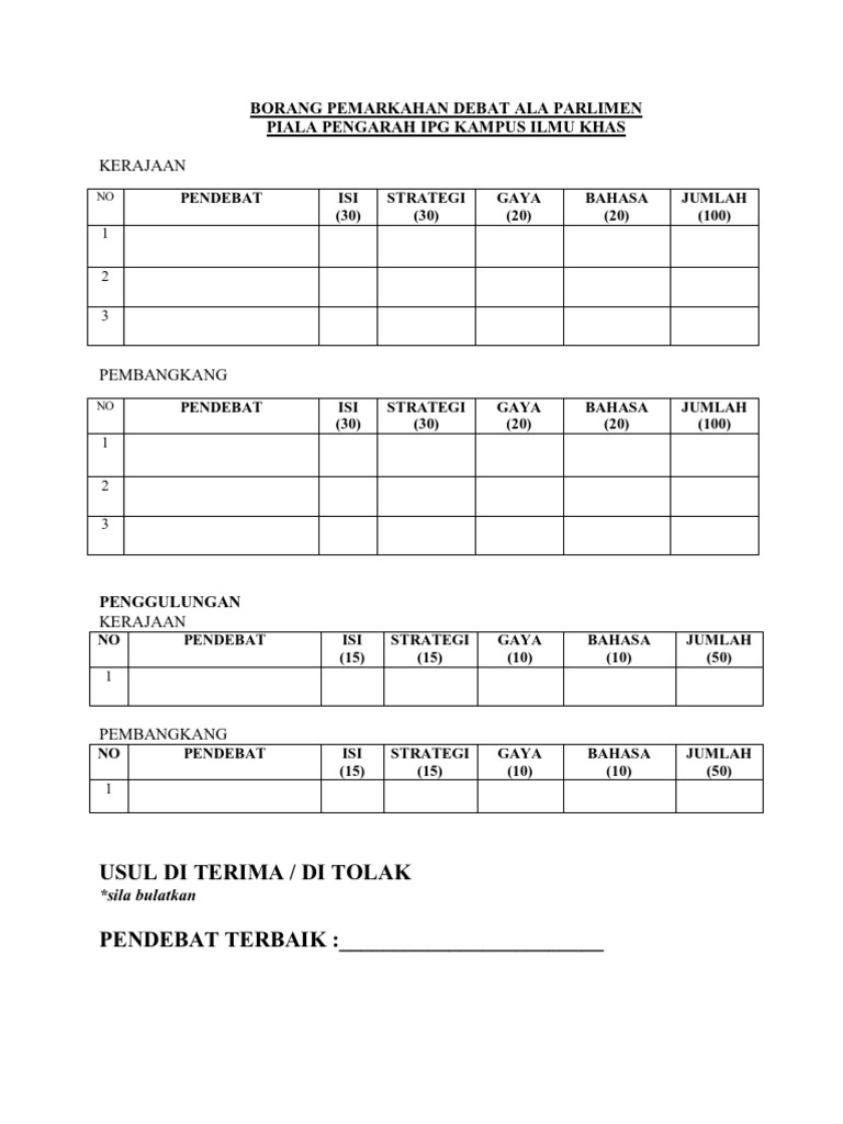 Borang Pemarkahan Debat Ala Parlimen Pdf